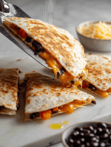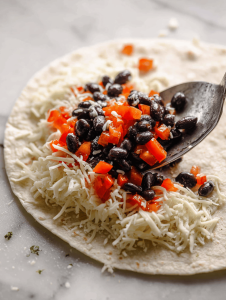 - Lay a tortilla flat on a clean surface, then spread a thin layer of shredded cheese over half of it. Sprinkle some black beans and chopped orange peppers on top of the cheese for vibrant color and texture.