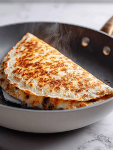 - Place the folded tortilla into the preheated skillet. Cook for about 2-3 minutes, until the bottom is golden brown and crispy, and you hear a gentle sizzling sound.