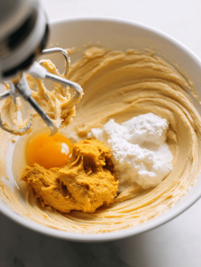 - Add the egg to the butter mixture and beat until well incorporated. Then stir in the pumpkin puree and vanilla extract until the mixture is smooth.