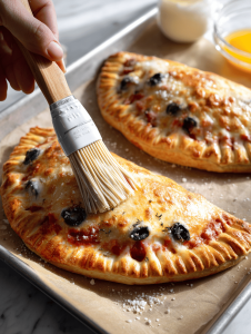 - Arrange the shaped calzones on a parchment-lined baking sheet. Brush the tops with beaten egg for a shiny, golden finish.