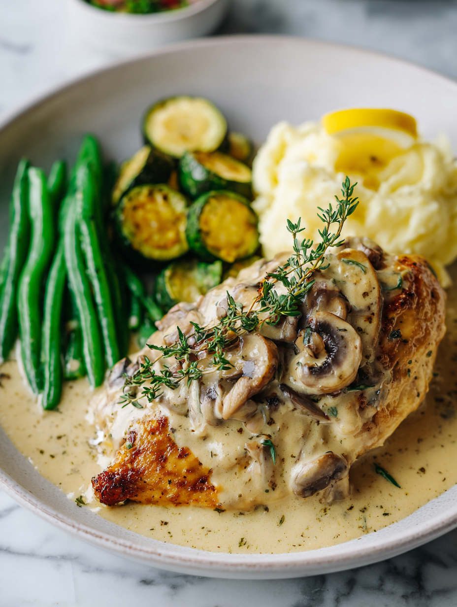 Chicken Supreme features tender, juicy chicken breasts cooked until golden and crispy, then topped with a rich, creamy sauce infused with garlic, white wine, and herbs. The dish is finished with sautéed mushrooms and a silky sauce that clings to the chicken, creating a comforting yet elegant plate with a beautiful, glossy appearance. Perfect for cozy dinners and easy to adapt with seasonal ingredients or personal touches.