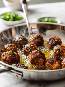 6. Carefully place the meatballs into the hot skillet, making sure not to overcrowd, and sear them until deep golden brown on all sides, about 8-10 minutes.