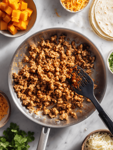Step 2: Prepare the taco fillings: cook seasoned ground meat or veggie mix until browned and fragrant.