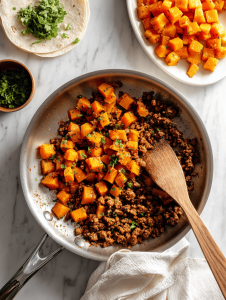 - Heat a skillet over medium heat, add the ground meat or veggie mix, and cook until browned and fragrant, about 8 minutes. Stir in taco seasoning and a splash of water if needed to keep it moist.