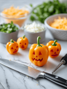 Step 5: For a fun touch, carve small faces into cheese slices or use bell peppers for ghostly shapes.